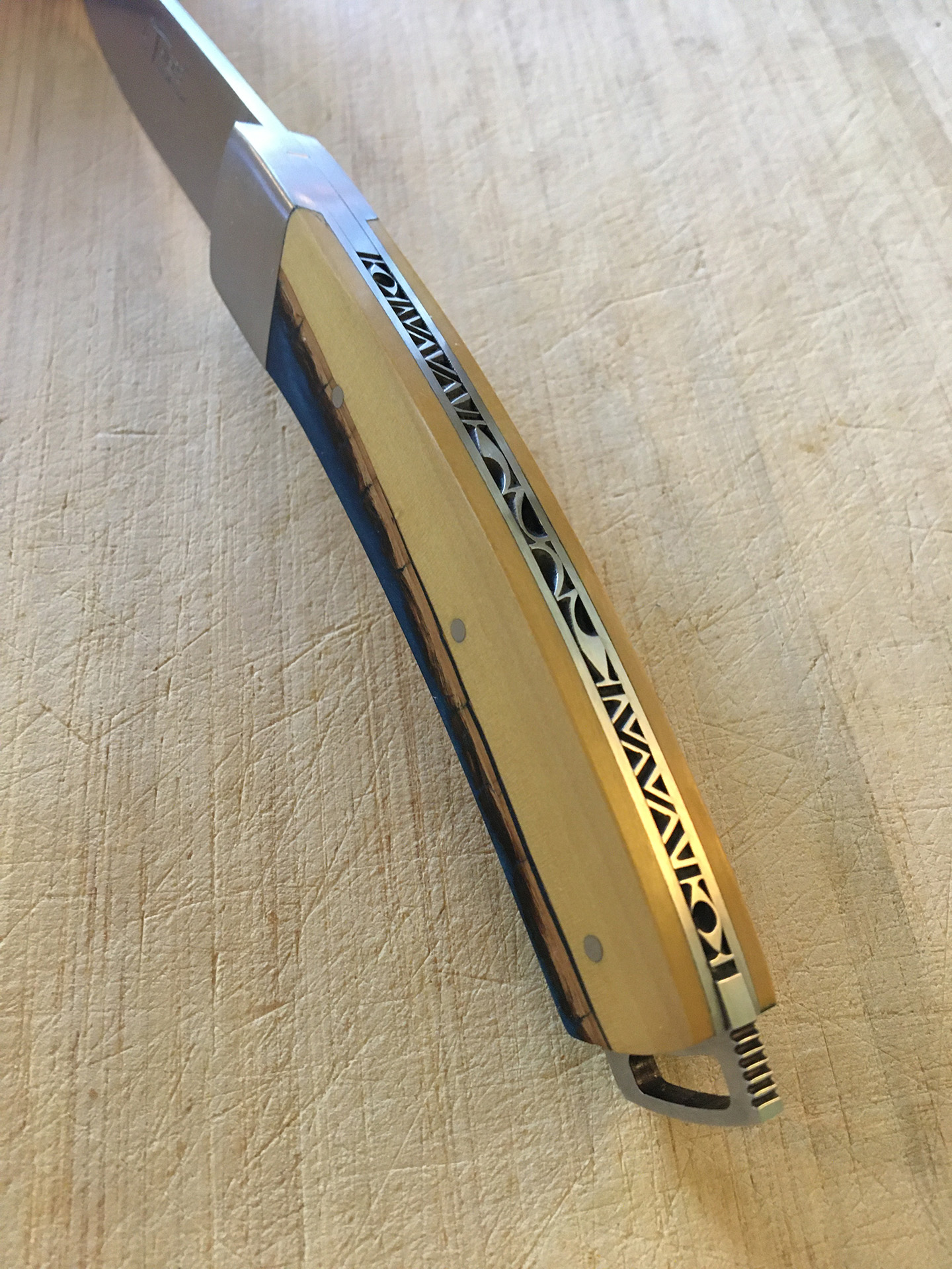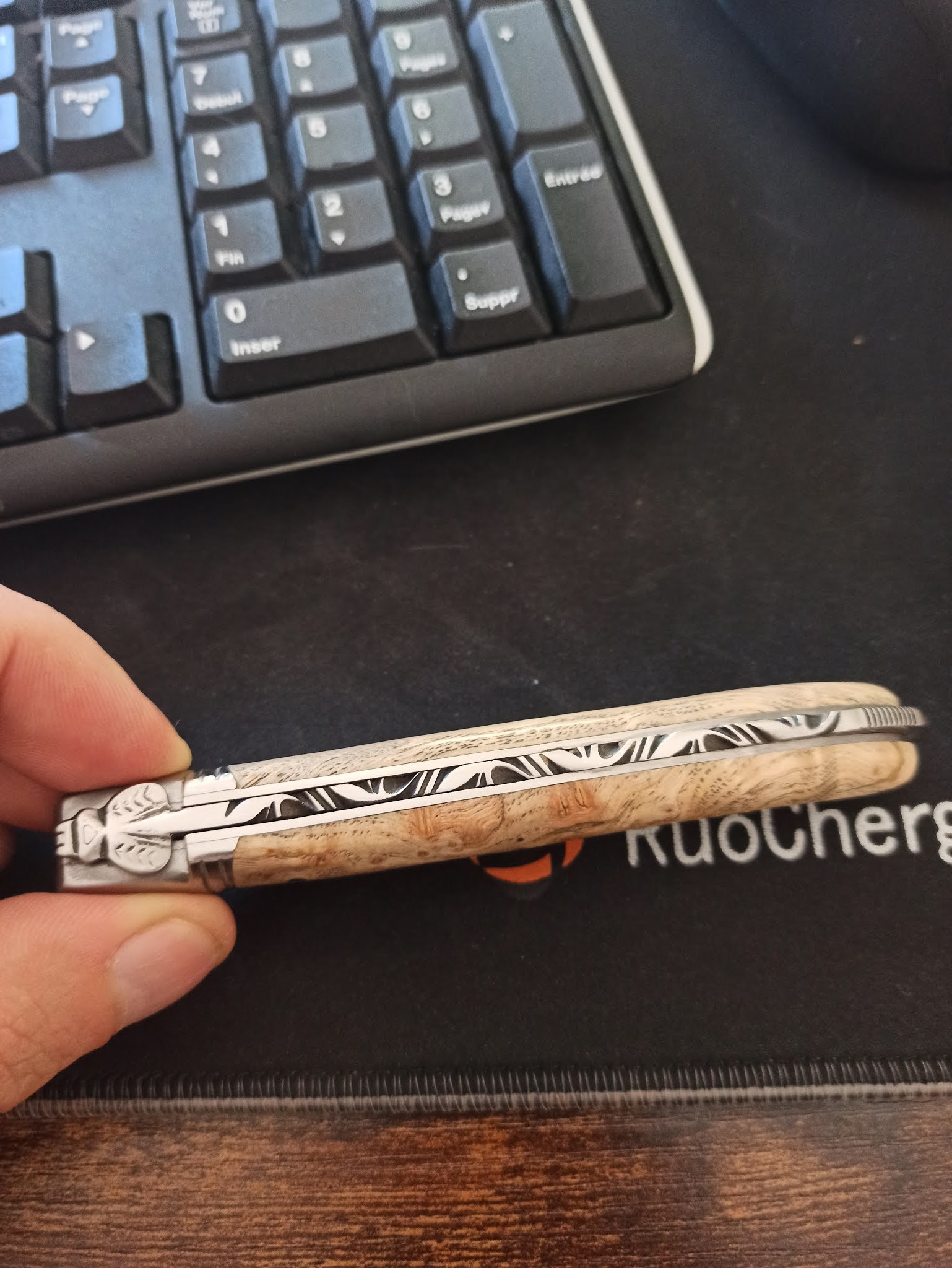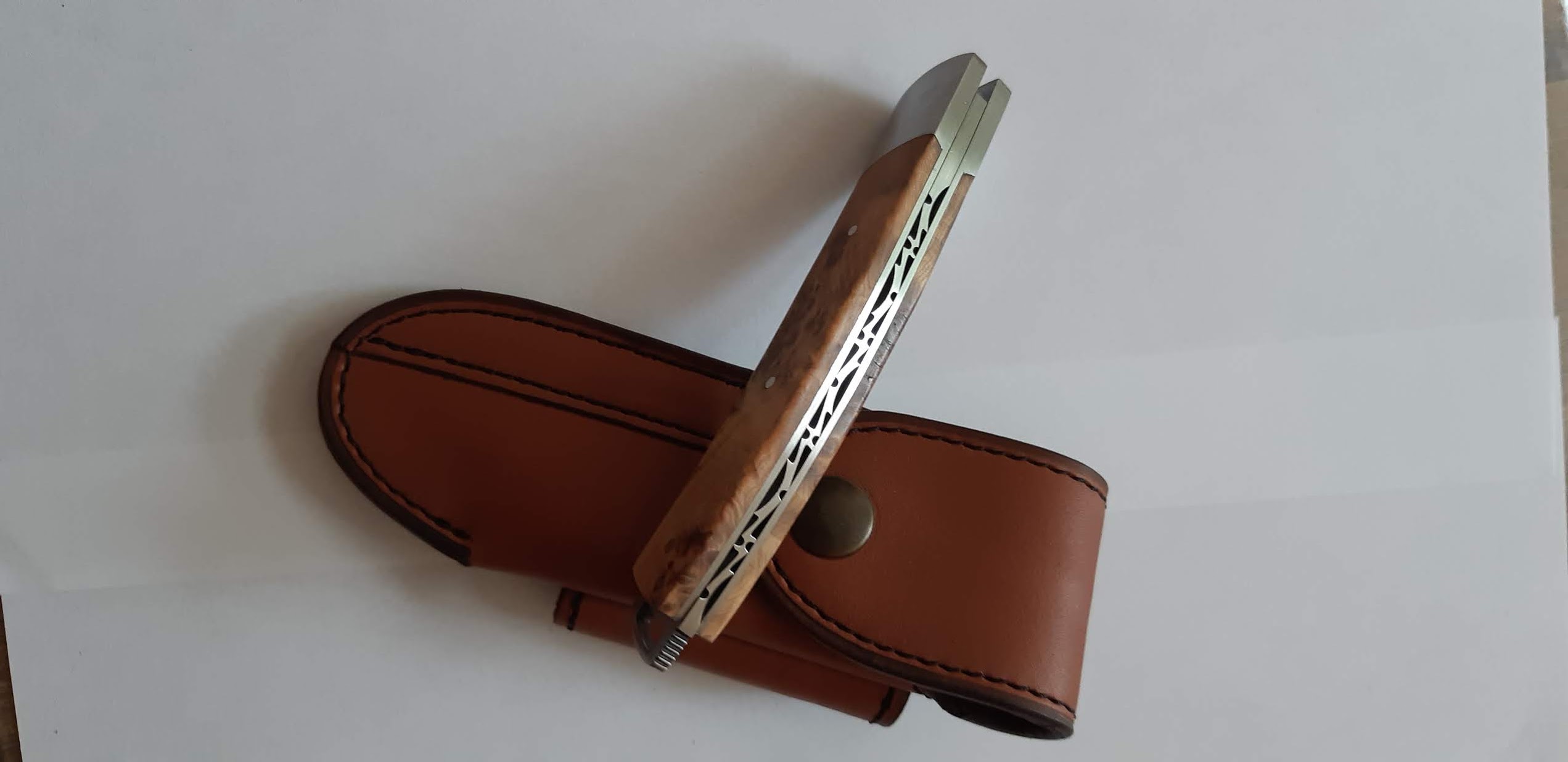 Couteau Le Thiers commandé via le site internet. Très joli couteau et superbe travail. Mes initiales ont été gravées et le résultat est très joli. Le bois choisi est très bien ajusté et le veinage est parfait. Du très bon boulot. Je suis très content de mon achat et referais le même si je devais m'en offrir un nouveau. J'ai toutefois une question. Lorsque je coupe une matière un peu dure (par exemple je tombe sur un os), la lame a tendance à légèrement se relever au niveau du haut du ressort guilloché (à la jonction de la lame et du manche) et faire une sorte de petit clic. Ce n'est pas plus gênant que ça, mais est-ce normal ? De toutes façons, pas d'inquiétude ce couteau est garanti et la société est sérieuse. Vous pouvez acheter les yeux fermés.