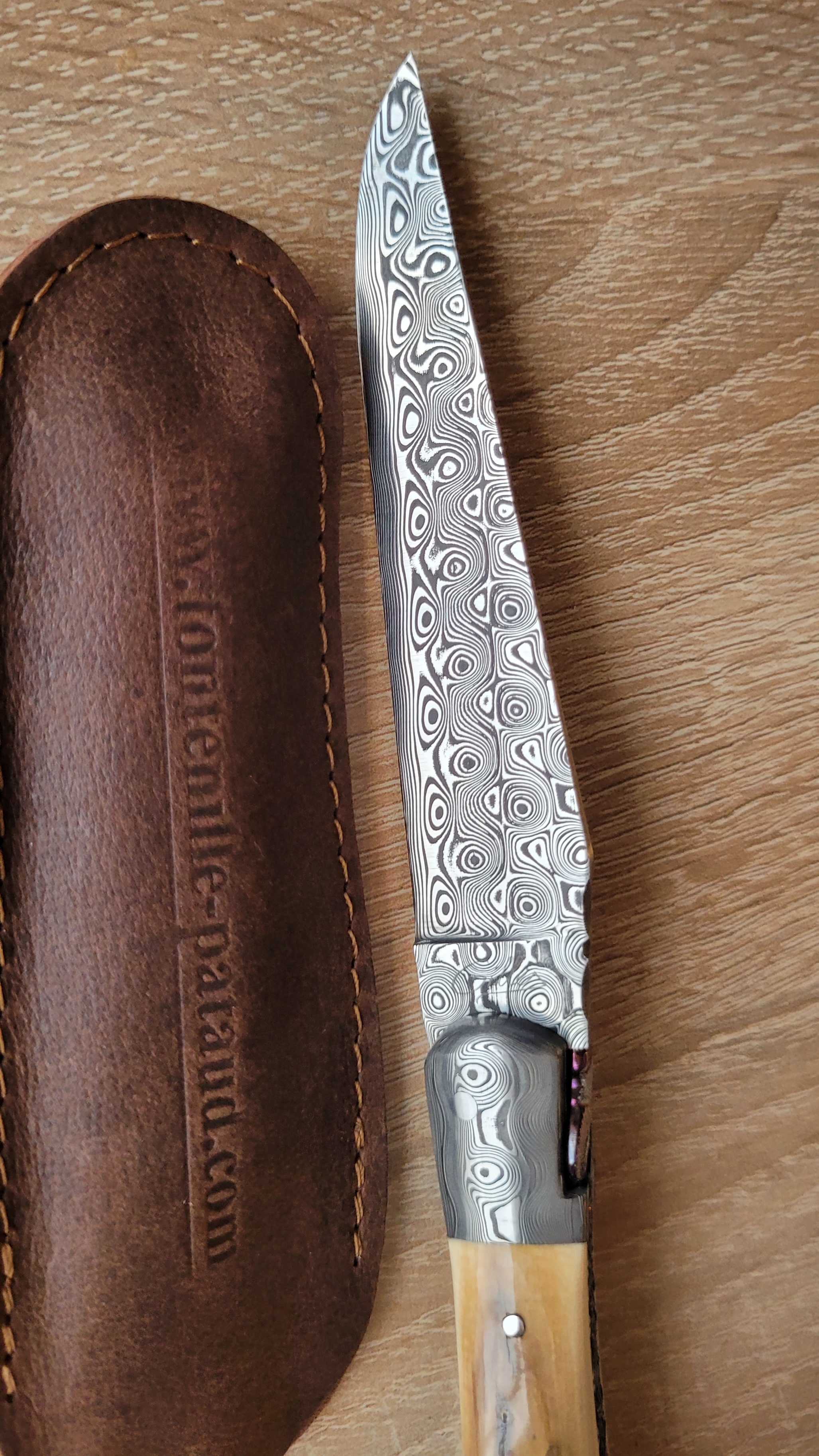 Couteau commandé pour mes 60 ans , lame damassé 160 couches et manche en ivoire de mammouth. Un travaille magnifique , vraiment.