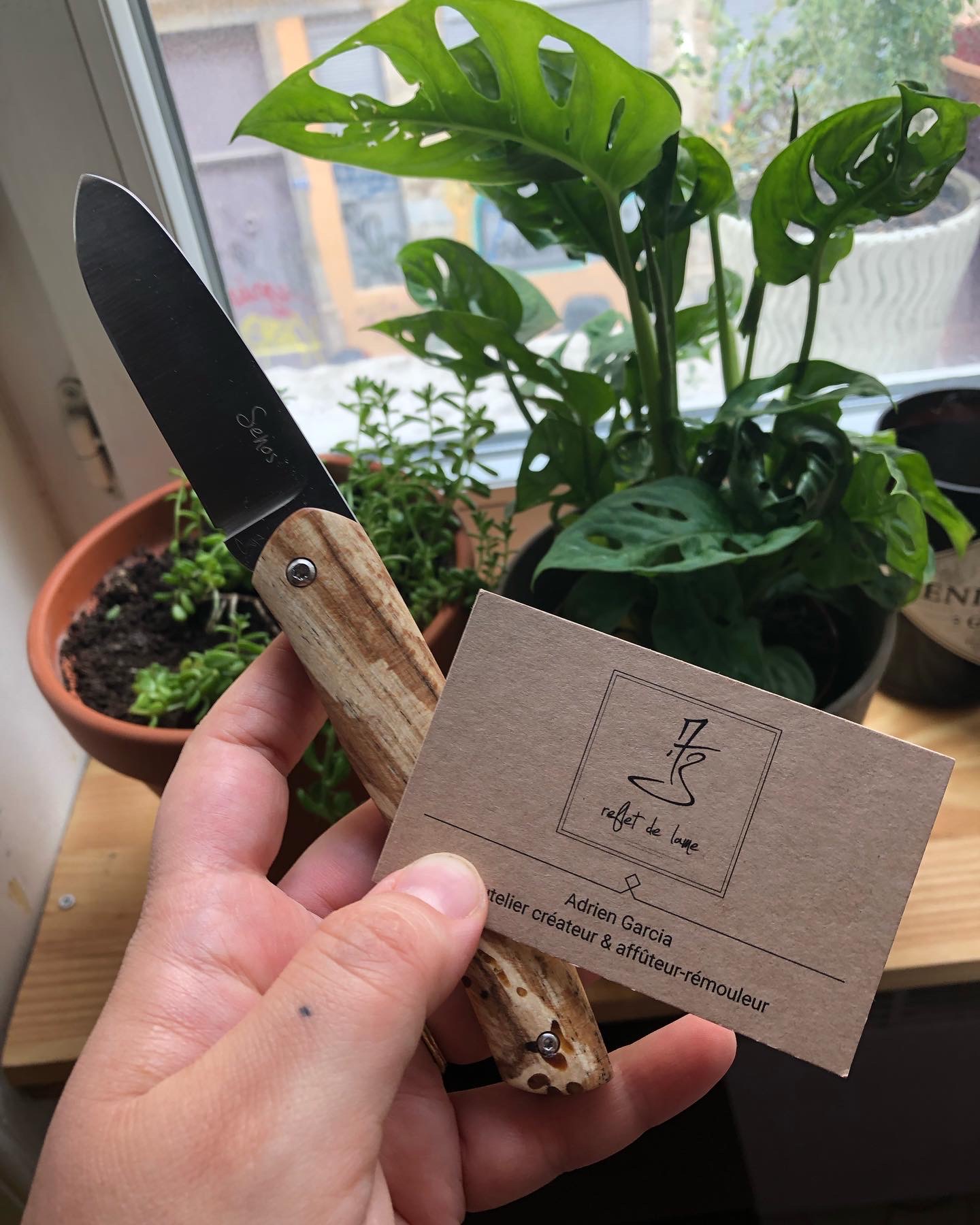Nous avons la chance de posséder 2 couteaux fabriqués entièrement à la main par Adrien Garçia. (photos) Couteau unique et personnalisable. Nous avons été bluffés par la qualité et la finition. Bonne prise en main, agréable au touché et la lame est très tranchante. Tout simplement parfait, la qualité est au rendez-vous. Nous recommandons sans hésiter cet artisan passionné par son métier. Nous lui avons confié un couteau marin « Le London » pour un affûtage, nous somme certain de le récupérer aussi tranchant qu’au premier jour. Merci Adrien. 5 étoiles pour Reflet de lame !
